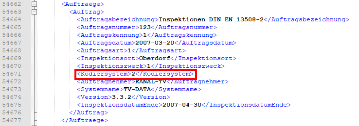 Das Kodiersystem im Bereich Auftrag ist nach BFR A (ehemals Arbeitshilfen Abwasser) mit einer Referenzliste „U102 Kodiersystem“ versehen. Im Bereich Kodiersystem ist in der xml der Wert „7“ eingetragen. Für das Austauschformat ISYBAU 2006 gibt es den Wert 7 nicht in der Auswahlliste. Der Wert 7 ist erst mit den späteren ISYBAU Austauschformaten hinzugekommen.