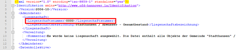 Fehlender Eintrag zur Liegenschaft im Bereich der Admindaten und der Liegenschaft. Im folgenden Screenshot befindet sich eine beispielhafte Definition einer Liegenschaftsnummer im ISYBAU Dokument.