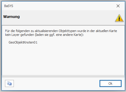 Beim Konstruieren von Objekten kann es zu einer Meldung (Warnung) kommen, wenn die in dem Grafiksystem genutzten Karte keine passende Layervorlage zu dem zu konstruierenden Objekttyp vorhanden ist. Die Meldung lautet wie folgt: „Für die folgenden zu aktualisierenden Objekttypen wurde in der aktuellen Karte kein Layer gefunden (laden Sie ggf. eine andere Karte)“. Eine Auflistung nach dieser Warnung zeigt an, für welchen Objekttyp keine Layervorlage geladen ist.