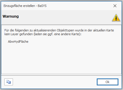 Beispiel 2: In BaSYS Plan 9 wird mit Hilfe der Funktion „Einzugsfläche erstellen“ eine Einzugsfläche konstruiert. Beim Beenden erscheint die genannte Meldung.