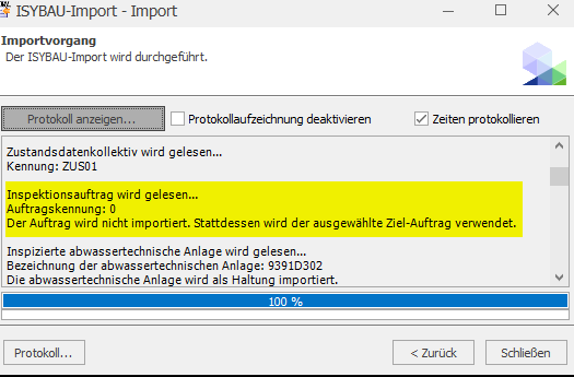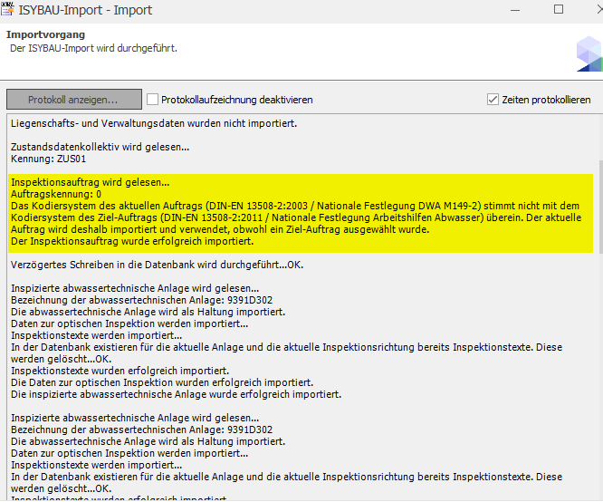 Demzufolge kommt neben dem Hinweis im Importwizzard, dass Aufträge zum Kodiersystem passen müssen, dann im Importprotokoll die Meldung, wie verfahren wurde:
