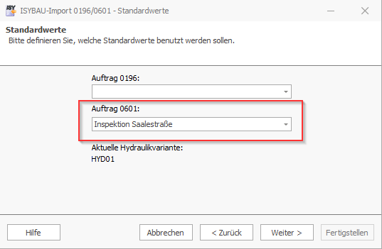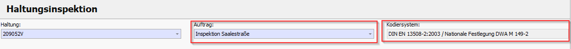 Da der in Ihrem Projekt vorhandene Auftrag einem Kodiersystem zugeordnet ist, dass DIN EN Codes berücksichtigt wird Ihnen in den jeweiligen Auswahllisten für die Aufträge ISYBAU 0196 (Auftrag 0196) und die Auftrage ISYBAU 0601 (Auftrag 0601) kein Eintrag in der Auswahlliste für den in Ihrem Projekt vorhandenen Auftrag Inspektion Saalestraße zur Auswahl angeboten.