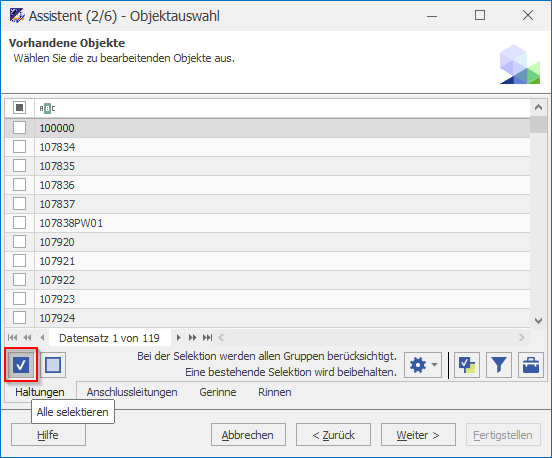 Starten Sie das Geometrie Tool und bestätigen Sie mit Weiter. Anschließend können Sie die zu aktualisierenden Haltungen mit einem Häkchen versehen oder auch über Alle selektieren jegliche Haltung auswählen.