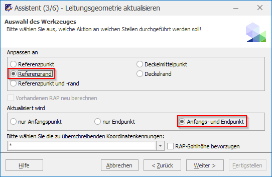 Bestätigen Sie anschließend mit Weiter. Im folgenden Fenster können Sie den Referenzrand unter „Anpassen an“ auswählen. Weiterhin sollte diese Einstellung für den Anfangs- und Endpunkt erfolgen.