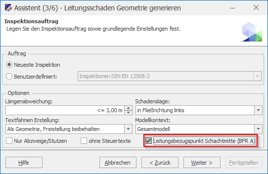 Es gibt auch die Möglichkeit direkt bei der Schadensgeometrieerstellung den Leitungsbezugspunkt auf die Schachtmitte zu verlegen. Hierzu führen Sie wie gewohnt das Geometrietool „Leitungsschaden Geometrie generieren“ aus und setzen ein Häkchen auf der dritten Seite bei „Leitungsbezugspunkt Schachtmitte (BFR A)“, so wie im folgenden Screenshot ersichtlich.