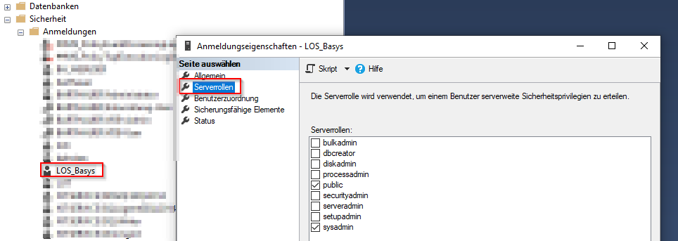 Sollte es aus Sicherheitsgründen nicht zulässig sein, dass der Benutzer volle Zugriffsrechte auf den SQL Server bekommt, können die Rechte auch datenbankabhängig erteilt werden.