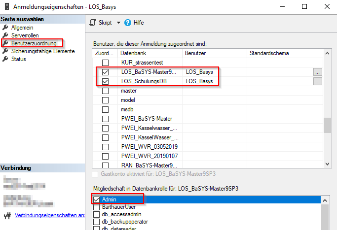 Dafür muss in den Eigenschaften des Benutzers der Menüpunkt „Benutzerzuordnung“ ausgewählt werden. Nun kann dem Benutzer per Haken setzen neben den Datenbanken, die benötigten Datenbanken zugewiesen werden. Damit der Benutzer sowohl Lese- als auch Schreibrechte auf der Datenbank bekommt, muss ihm die [Mitgliedschaft in der Datenbankrolle] „Admin“ zugewiesen werden.