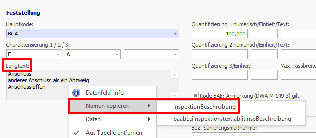 Um den Langtext eines Inspektionstextes zu erhalten, sollte daher das Datenfeld „InspektionsBeschreibung“ genutzt werden. Dieses Datenfeld besteht aus dem Langtext des Schadens und wird zusammen gesetzt aus dem Hauptkode sowie den Charakterisierungen. Langtext und Charakterisierungen werden dabei mit einem Zeilenumbruch dargestellt, dem sogenannten „Newline()“ und haben daher unterschiedliche Auswirkungen in der Darstellung in der ARENA und im Lageplan.