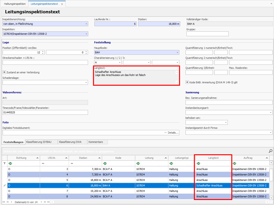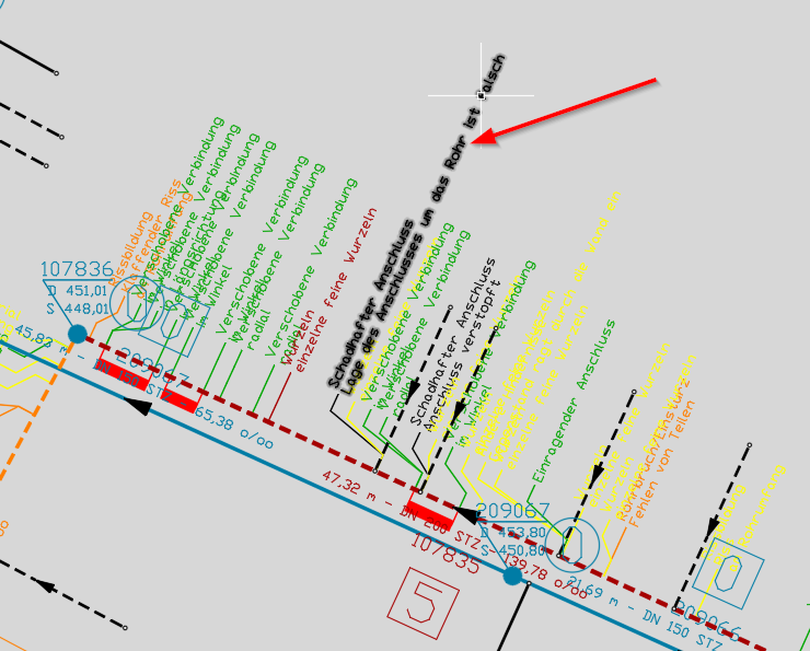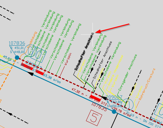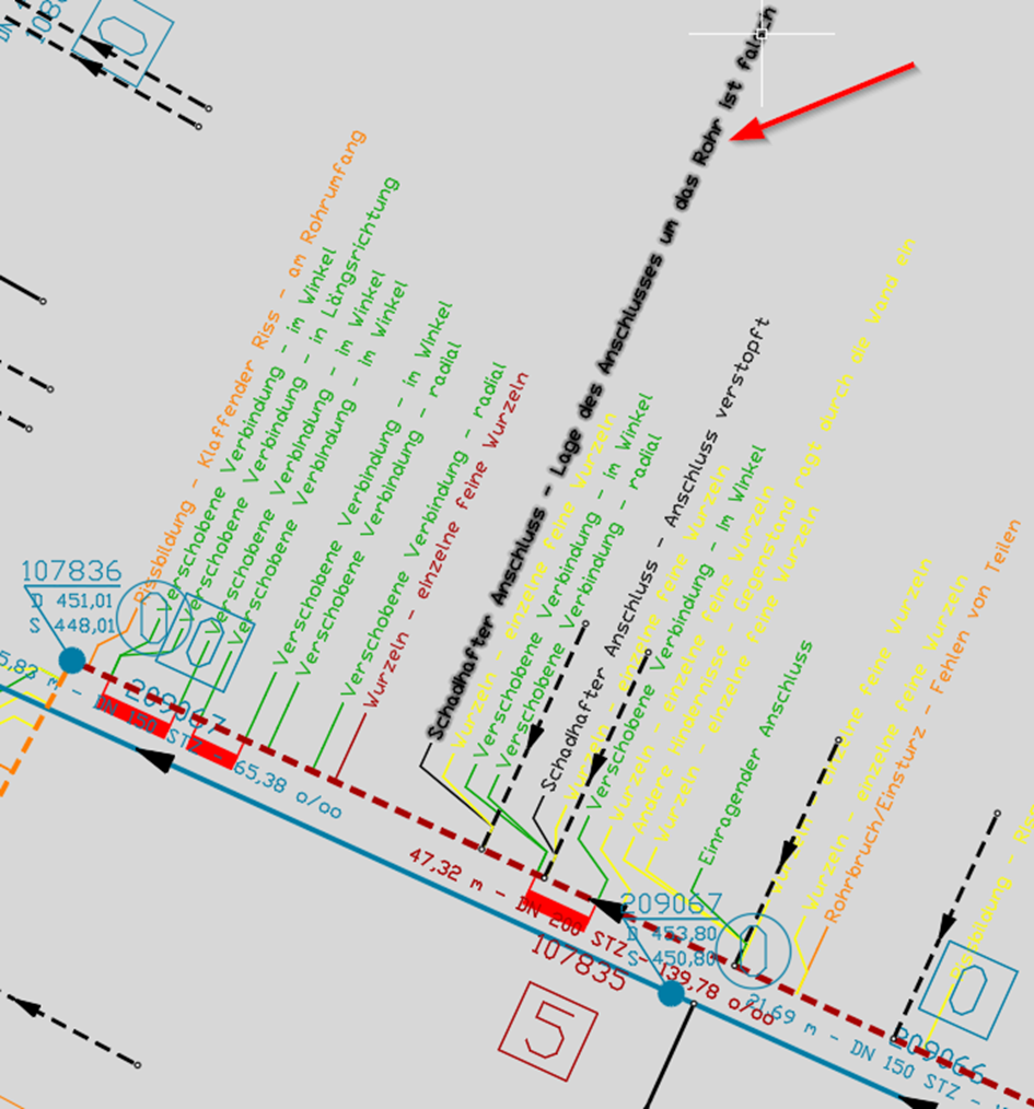 PLAN: Durch die Nutzung des mehrzeiligen Datenfeldes „InspektionsBeschreibung“ im Modell wird auch im Lageplan der Inspektionstext mehrzeilig dargestellt, bestehend aus dem Hauptkode sowie den Charakterisierungen.