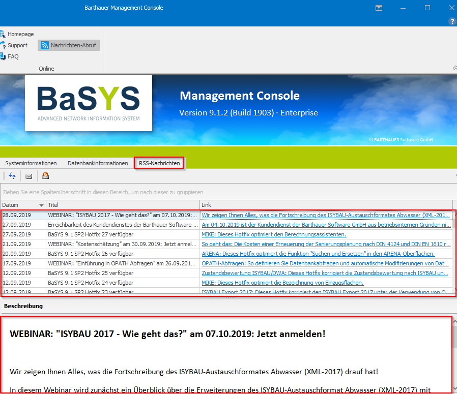 Die Informationen über erschienene Hotfixe können Sie in der BaSYS Management Console unter dem Reiter „RSS-Nachrichten“ abrufen.