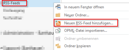 Klicken Sie dafür einfach mit einem Rechtsklick auf den Ordner „RSS-Feeds“ und anschließend auf „Neuen RSS-Feed hinzufügen und geben Sie dort den folgenden Link ein: