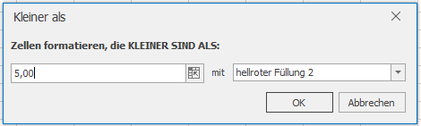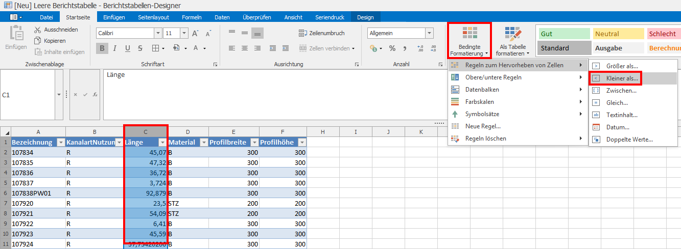 Als Beispiel wird das Datenfeld Länge für die bedingte Formatierung genutzt, hier sollen alle Zellen farblich hervorgehoben werden, welche kleiner als 5 m sind.