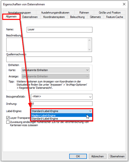 a. Umstellen der Label-Engine in den Eigenschaften des Datenrahmens: