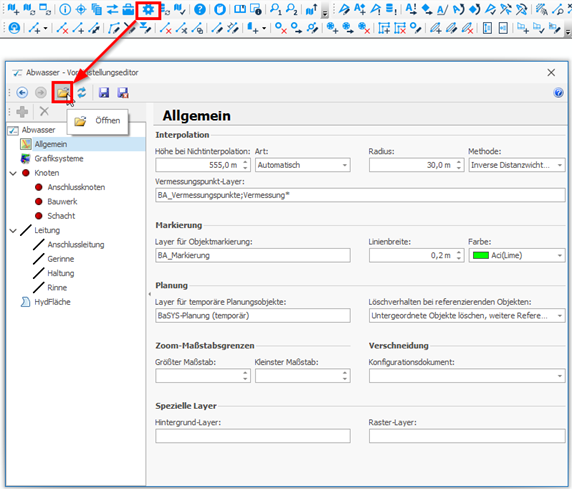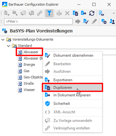 Es öffnet sich der Barthauer Configuration Explorer im Bereich der BaSYS-Plan Voreinstellungen. Per Rechtsklick auf das Dokument „Abwasser“ kann dieses „Dupliziert“ werden.