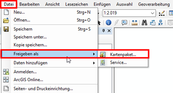 4. Wenn alle notwendigen Daten im GIS System geladen sind, dann kann über das Register „Datei“ und „Freigeben als“ das ganze Projekt als „Kartenpaket“ gespeichert werden.