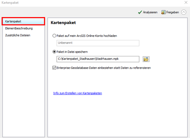 a. Unter dem Register „Kartenpaket“ kann definiert werden, ob das Kartenpaket auf ein ArcGIS Online-Konto oder in einer Datei (.mpk) gespeichert werden soll.