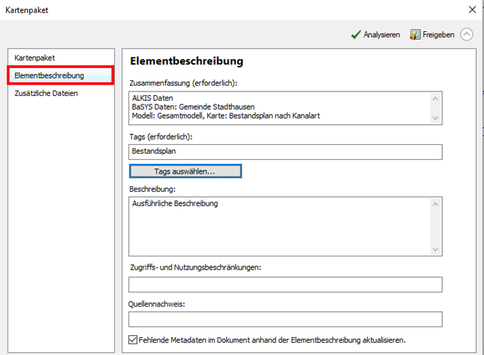b. Im Register „Elementbeschreibung“ kann eine Beschreibung der Daten erfolgen. Dabei ist die Zusammenfassung sowie die Definition von Tags unbedingt erforderlich.