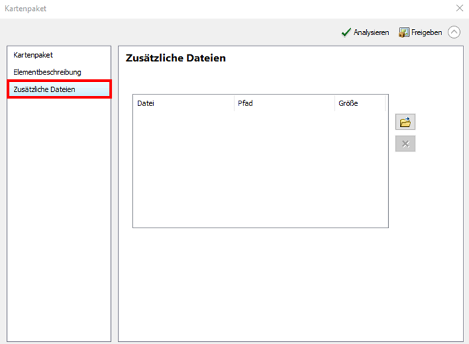 c. Unter dem Register „Zusätzliche Dateien“ können weitere Dateien angegeben werden, die im Kartenpaket enthalten sein sollten. Dies können ausführliche Dokumentationen, Berichte, Diagramme, etc. in den folgenden Formaten sein: .js, .vbs, .py, .pyc, .pyo, .bat und .ocx.