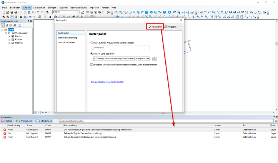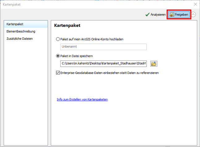 7. Klicken Sie nach Abschluss der Überprüfung auf „Freigeben“, um das Kartenpaket zu erstellen. Dabei werden alle Daten als Kartenpaket (.mpk) sowie das Projekt als (.mxd) gespeichert. Diese Daten können dann auf einem Rechner ohne BaSYS geöffnet werden.