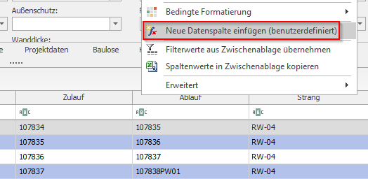 1. Öffnen Sie die KanDATA oder eine andere Management Maske und navigieren z. B. zu den Haltungen. Führen Sie einen Rechtsklick auf die Spaltenköpfe der tabellarischen Ansicht aus und wählen aus dem darauf folgenden Dialog den Punkt Neue Datenspalte einfügen (benutzerdefiniert) aus.