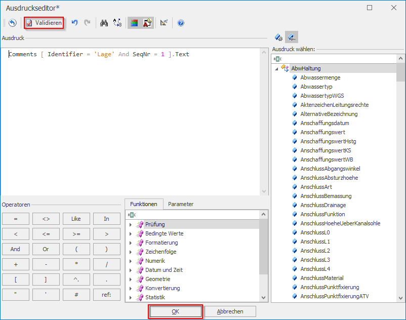 2. Dadurch öffnet sich nun ein Ausdruckseditor, in dem der nachfolgende Ausdruck eingegeben werden sollte. Dazu können Sie entweder die Objekthierarchie und die Operatoren nutzen oder Sie tragen den Ausdruck von Hand ein. Überprüfen Sie den Ausdruck mit dem Button Validieren im Menü und bestätigen Sie die Eingabe mit OK.