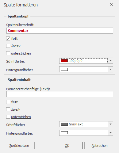 3. Sie haben nun die Möglichkeit der Spalte einen Namen zu geben und das Aussehen zu ändern, indem Sie per Rechtsklick auf den Spaltenkopf das Kontextmenü öffnen und unter dem Punkt Erweitert den Punkt Spalte formatieren wählen. In dem sich öffnenden Fenster können Sie nun die Bezeichnung „Kommentar“ angeben und weitere Formatierungen vornehmen.