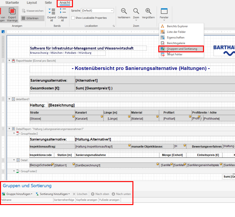 Im Berichtsdesigner können die Objekte nach einer oder mehreren Datenspalten (Beispiel: Bezeichnung, Strang, etc.) sortiert werden. Dabei hat die Sortierung in der im Bericht hinterlegten Opath-Abfrage KEINE Auswirkungen auf die Sortierung in dem Bericht selber. Die gewünschte Sortierung wird in dem Berichtsdesigner selbst definiert.