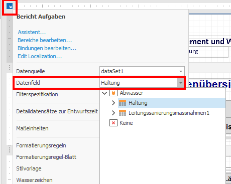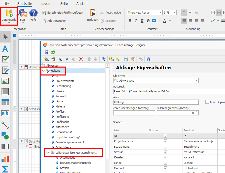 Beispiel: Die in dem Bericht hinterlegte Abfrage besteht aus einer Abfrage mit dem Objekttyp „AbwHaltung“ (Alias: Haltung) und einer Unterabfrage mit dem Objekttyp „Leitungssanierungsmassnahmen“ (Alias: Leitungssanierungsmassnahmen1).