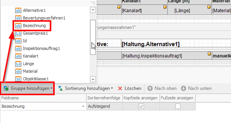 Wenn nun nach der Bezeichnung der Haltung sortiert werden soll, dann muss dem Bericht an folgender Stelle unter „Datenfeld“ die Abfrage der Haltung zugewiesen werden: