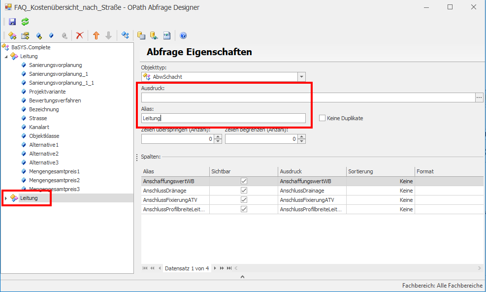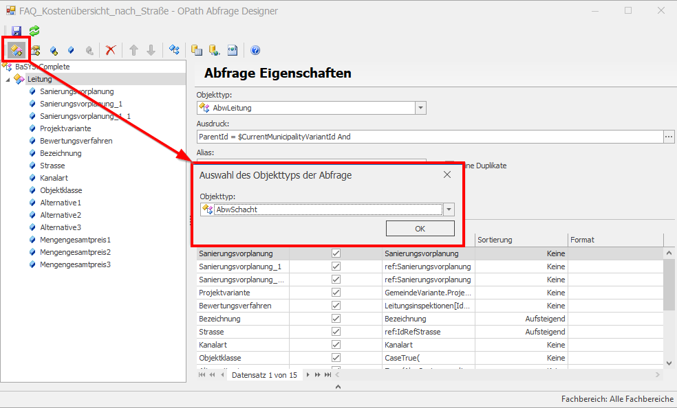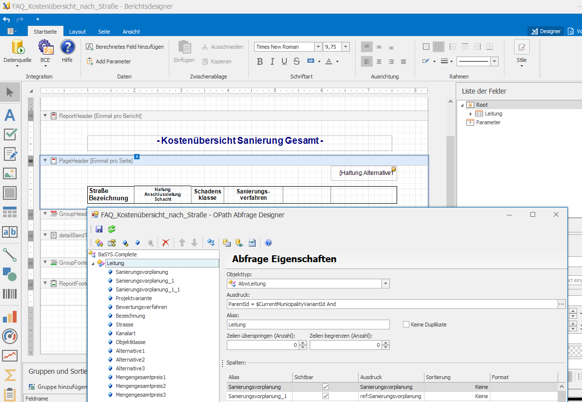 Als Beispiel wird im Folgenden ein Bericht erstellt, in welchem die Kostenübersicht der Sanierungen aller Objekte nach Straße ausgegeben werden soll. Die dem Bericht hinterlegte OPath Abfrage kann hierbei bei AbwLeitung starten und enthält somit alle Informationen zu Haltungen sowie Anschlussleitungen.