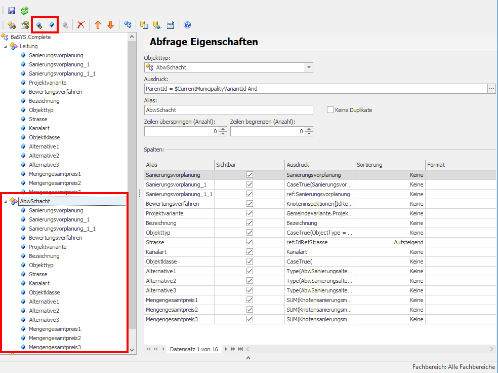 Im letzten Schritt markieren Sie die Abfrage „AbwSchacht“ und geben diesem über die Spalte „Alias“ denselben Namen wie die der Leitungen (in diesem Fall „Leitung“) und setzen noch den gewünschten Filter in der Spalte „Ausdruck“ (Filter auf aktuelle Gemeindevariante, Sanierungsalternative, etc.).