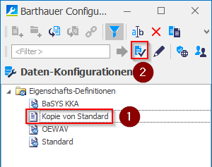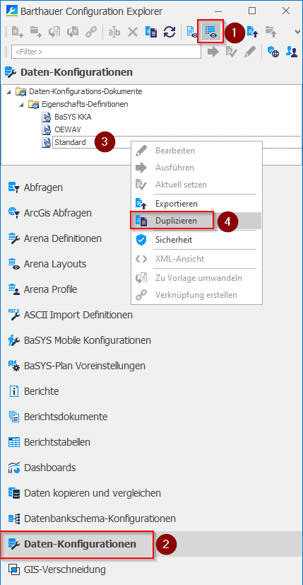 Öffnen Sie zunächst den Configuration Explorer und betätigen Sie das Icon „Ausgeblendete Gruppen anzeigen“ (1). Anschließend navigieren Sie zum Ordner Daten-Konfigurationen (2). Um die Datei „Standard“ der Eigenschafts-Definitionen bearbeiten zu können muss eine Kopie der Datei angelegt werden. Dafür muss per Rechtsklick (3) das Kontextmenü geöffnet und die Datei dupliziert werden (4).