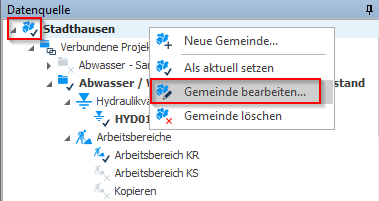 Über einen Klick mit der rechten Maustaste auf die aktuelle Gemeinde in dem Bereich der Datenquelle wählen Sie aus dem Kontextmenü die Funktion „Gemeinde bearbeiten“ auf.
