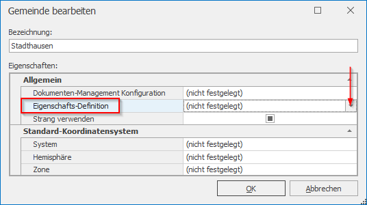 In dem Dialogfenster „Gemeinde bearbeiten“ rufen Sie in der Rubrik „Eigenschaften/ Allgemein“ die Einstellung „Eigenschafts-Definition“ auf.