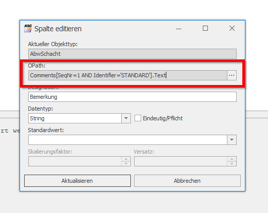Anschließend muss im ASCII Template in der Kommentarspalte die gewünschte Kennung im OPath-Ausdruck mit angeben werden.