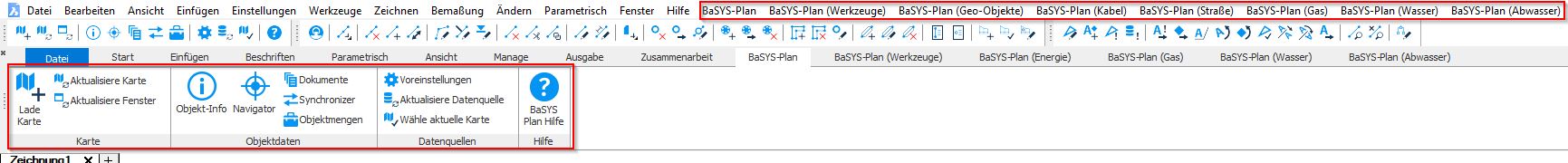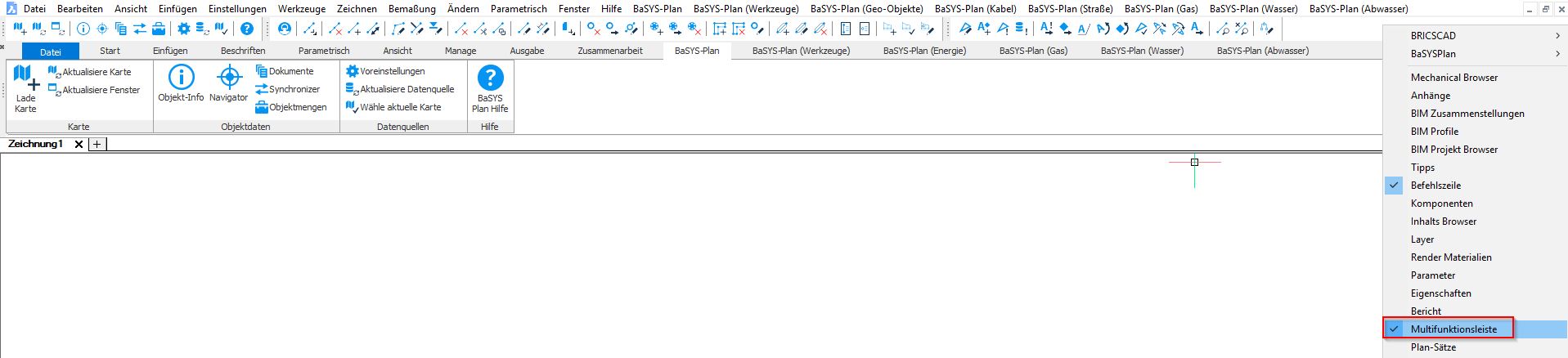 Damit die Multifunktionsleiste und/oder das Textmenü von BricsCAD für BaSYS Befehle genutzt werden kann muss mindestens BaSYS 9.1.1 installiert sein, sowie die folgenden Einstellungen getroffen werden.