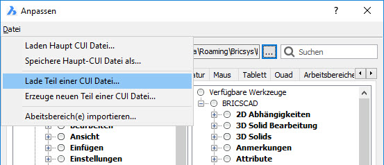 4. Mit dem BricsCAD Befehl „_cui“ die gewünschte *.cui Datei laden (zu finden in dem zuvor entpackten Verzeichnis).
