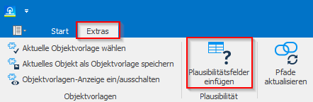 In allen Arena Sachdatenverwaltungen kann unter Extras mit einem Klick auf das Icon Plausibilitätsfelder einfügen das Fenster Plausibilitätsfelder geöffnet werden. In diesem Fenster können Plausibilitätsfelder neu definiert und vorgefertigte Plausibilitätsfelder der tabellarischen Ansicht der Arena-Oberfläche hinzugefügt werden.