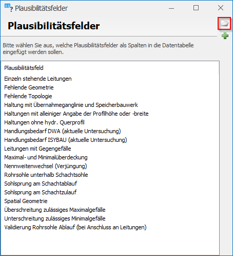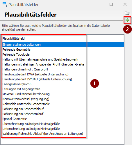 1. Nachdem ein Plausibilitätsfeld ausgewählt wurde (1), wird dieses mithilfe des Icons Plausibilitätsfelder hinzufügen der tabellarischen Ansicht hinzugefügt (2). Eine Mehrfachauswahl mithilfe eines Linksklicks bei gedrückter STRG-Taste ist möglich.