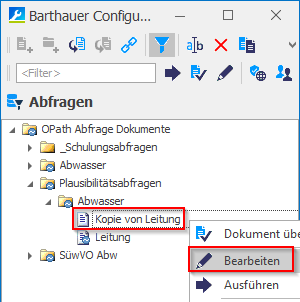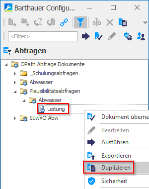 2. Mit einem Rechtsklick auf das Standard Dokument kann die Datei dupliziert werden. Dieses Duplikat kann anschließend benannt und bearbeitet werden. Nach einem Rechtsklick auf die neu erstellte Datei öffnet sich der Opath-Abfrage-Designer durch die Auswahl Bearbeiten.
