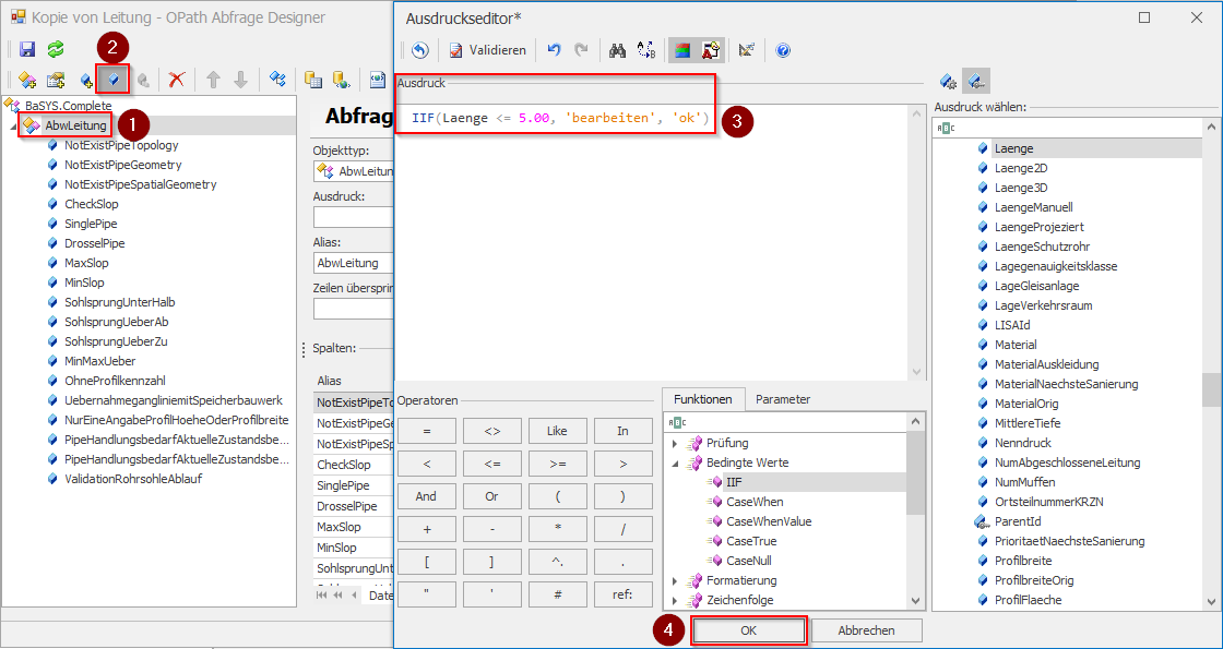3. Nachdem eine Abfrage ausgewählt wird (1) muss mit einem Klick auf das Icon Spalte hinzufügen eine Spalte hinzugefügt (2) werden. Dadurch öffnet sich der Ausdruckseditor, in dem eine Abfrage definiert werden kann (3). Diese Abfrage wird anschließend mit OK bestätigt (4). Ebenfalls kann anstelle des Hinzufügens einer neuen Spalte eine bereits existierende Abfrage verändert werden.