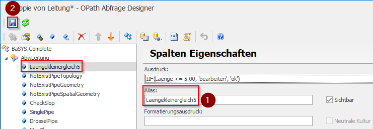 4. Der Name des Plausibilitätsfeldes kann im Feld Alias geändert werden (1). Die Datei muss mithilfe des Icons Speichern abschließend abgespeichert werden (2). Danach kann der Opath-Abfrage-Designer geschlossen werden.