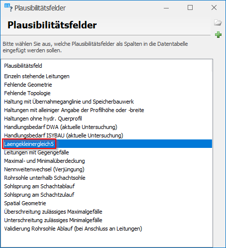 5. Nach der Auswahl der editierten Standarddatei erscheint nun im Auswahlmenü der Plausibilitätsfelder die neu erstellte Abfrage.