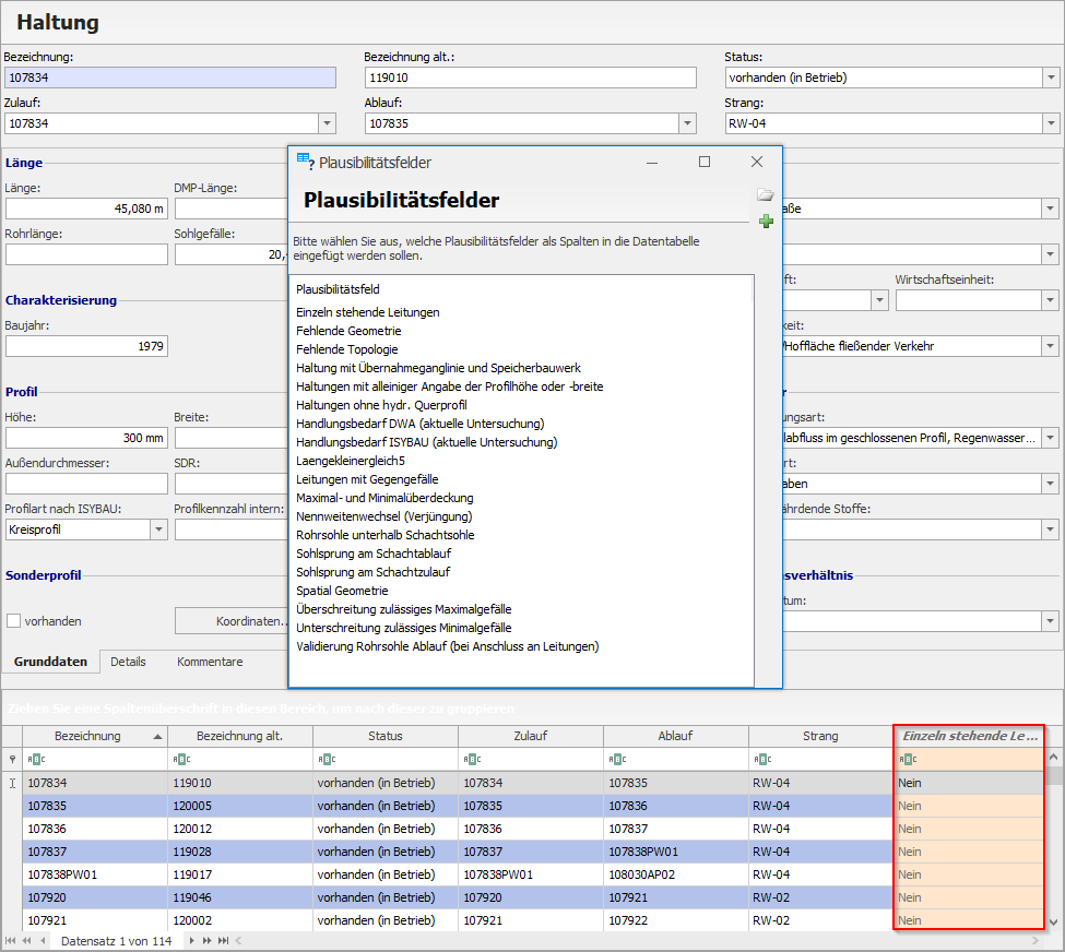 2. Das ausgewählte Plausibilitätsfeld erscheint nun in der tabellarischen Ansicht neben den bereits bestehenden Feldern.